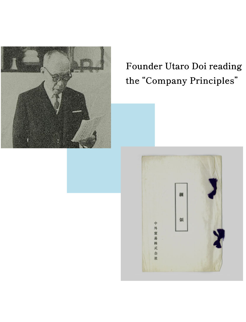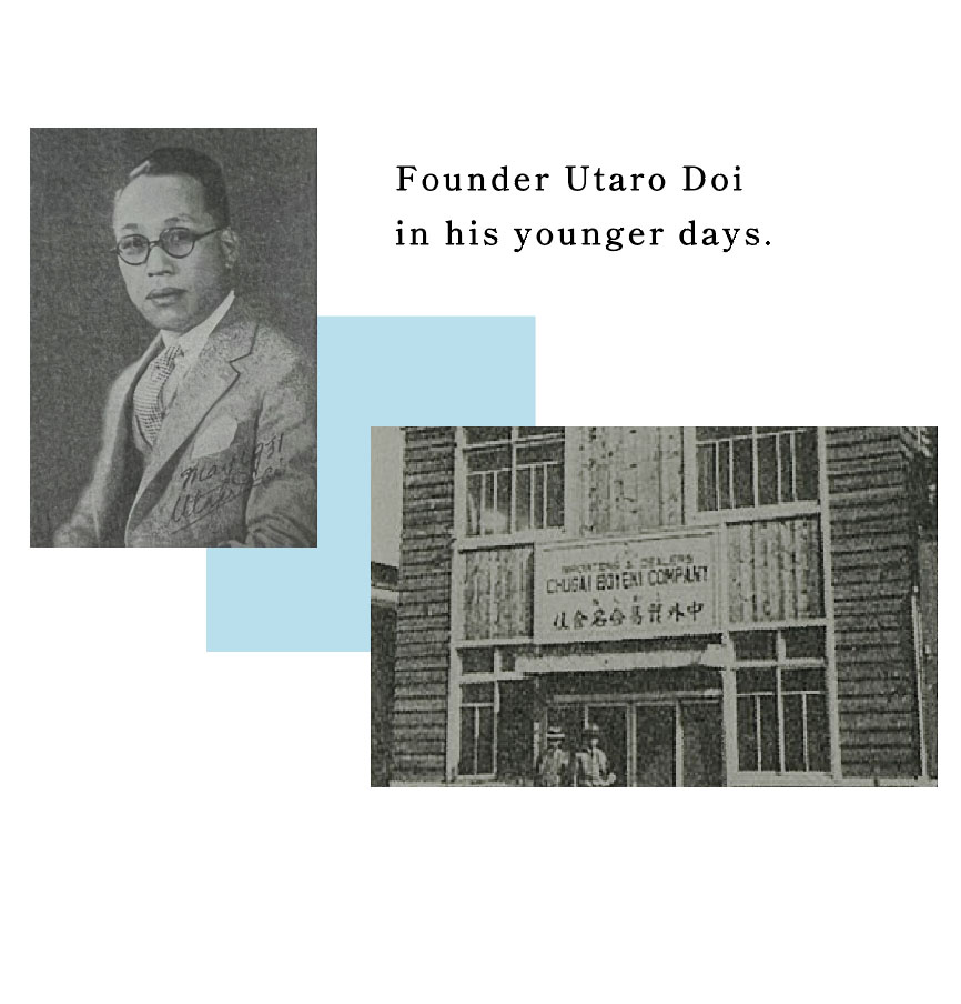 Established in January 1925 as Doi Utaro Shoten, the company was reorganized as an unlimited company and renamed Chugai Boeki Gomei Kaisha six months later on August 1. The name “Chugai (inside and outside)” was adopted as the company name to indicate that it was a trading company connecting Japan (inside=domestic) and overseas (outside=overseas) and continued to be used after the company was reorganized as a joint-stock company in 1935.